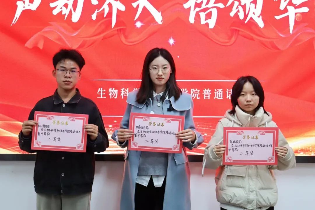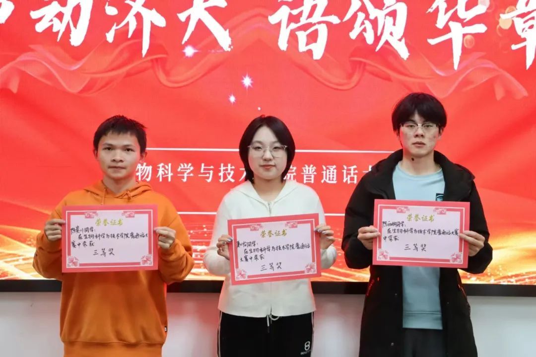 经过了紧张激烈的角逐,评委从选手的台风、普通话流畅程度等方面,进行了打分。最终,陈贵川、夏心怡、陈雨航获得三等奖,杨士博、杨晨婧、马妮获得二等奖,江晶莹、杨秋铭获得一等奖。