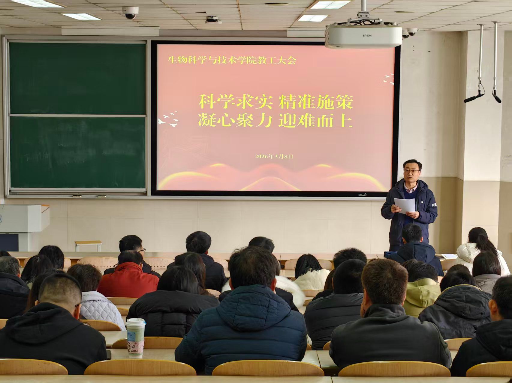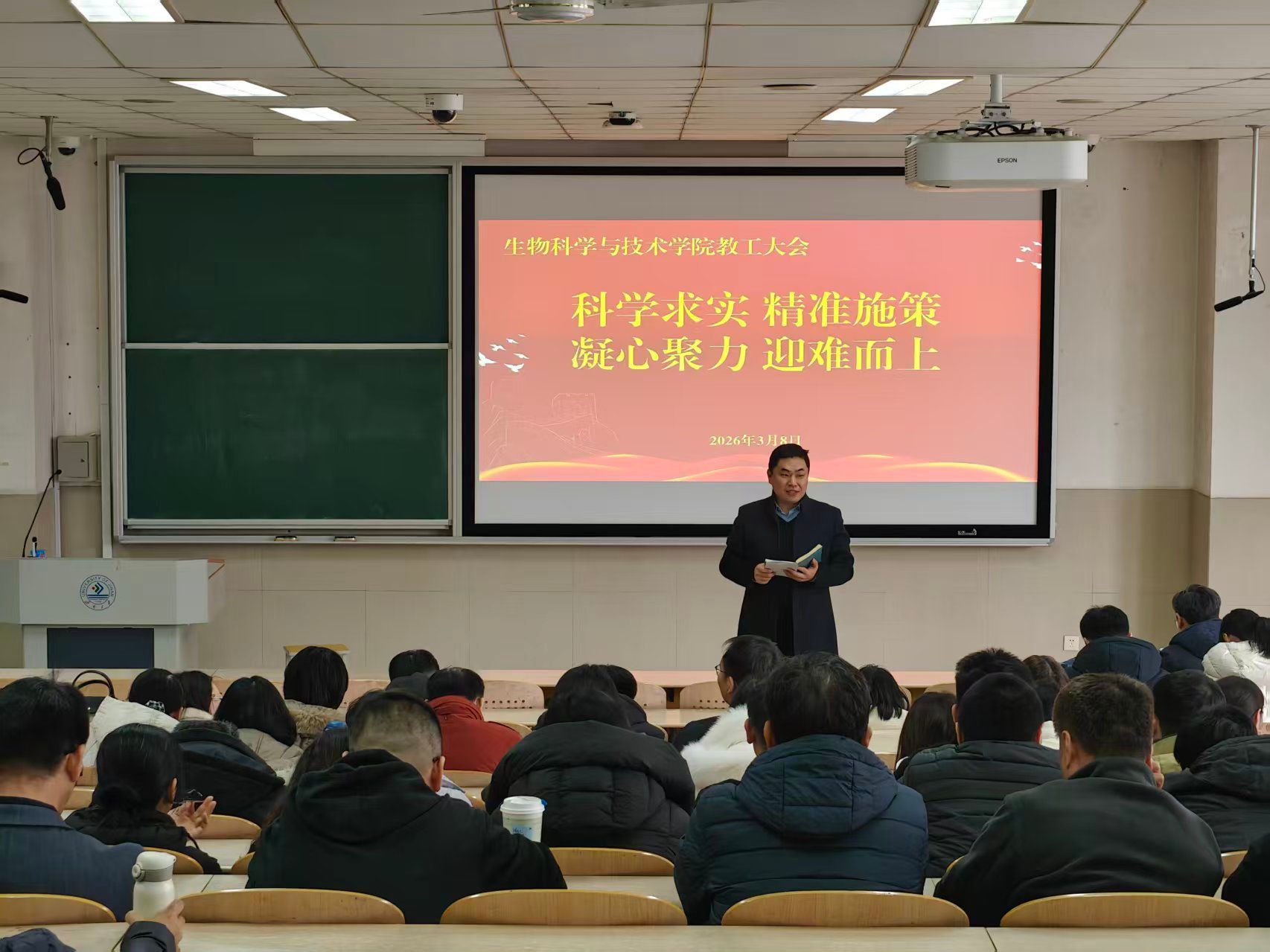 院长秦晓春作了题为《聚焦核心任务,准确识变、积极应变、主动求变》的报告,系统梳理了学院2025年各项任务指标的完成情况,从全面提升人才培养质量等八个方面对2026年工作进行部署。她指出,学院发展处于关键时期,必须认清形势、抢抓机遇,切实增强推动学院跨越发展的使命感与紧迫感。新学期要在巩固前期成果的基础上,锚定生物学博士点申报核心任务,奋力突破线性增长路径,推动学院各项事业实现“大”进步。