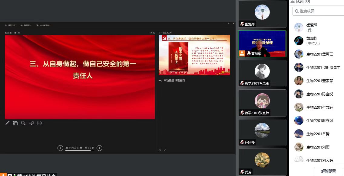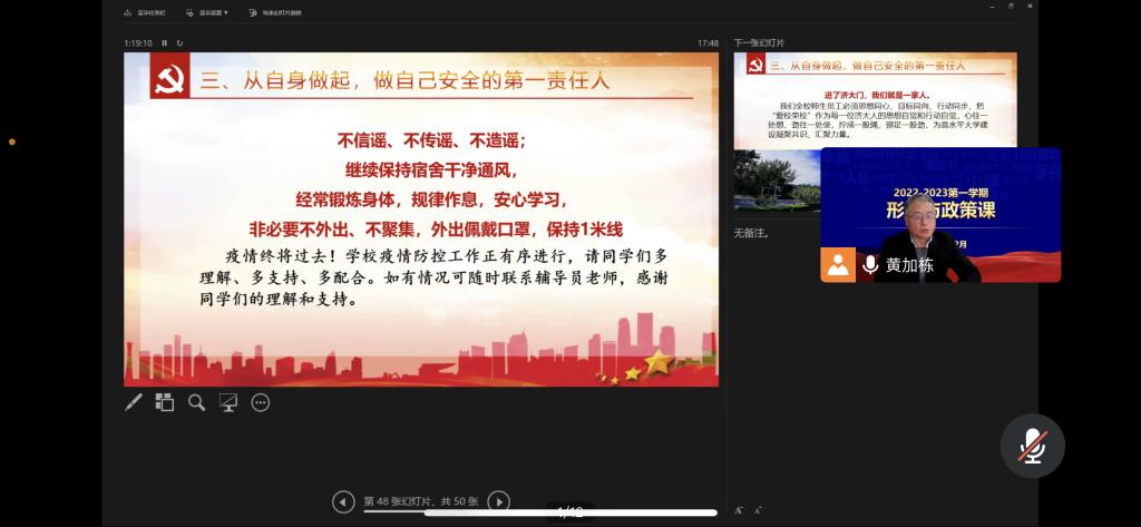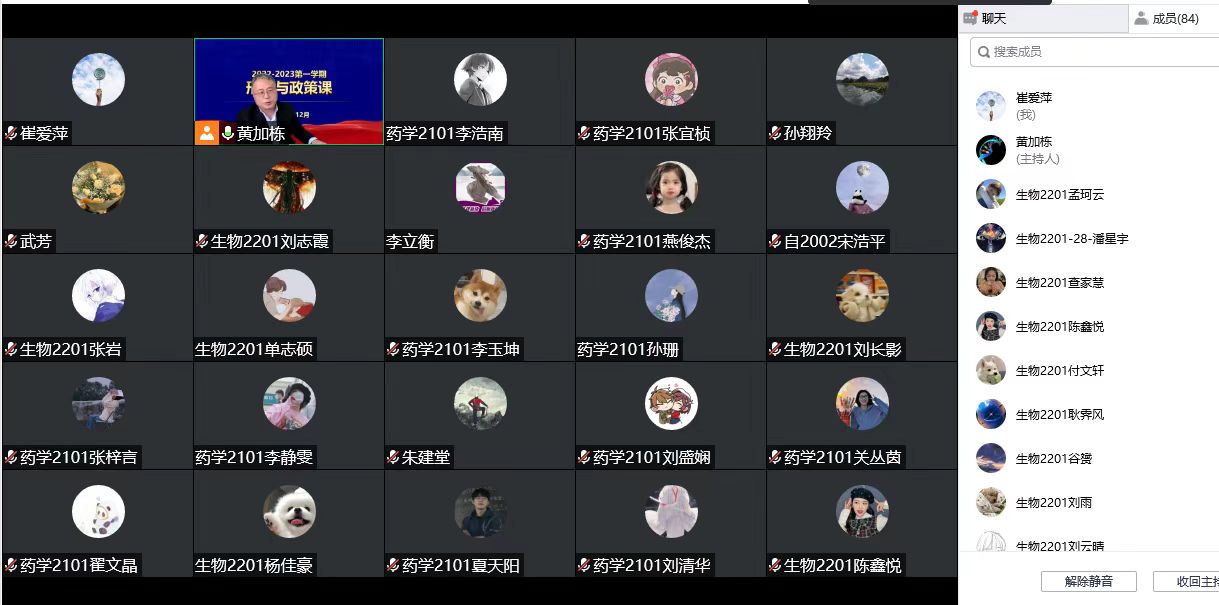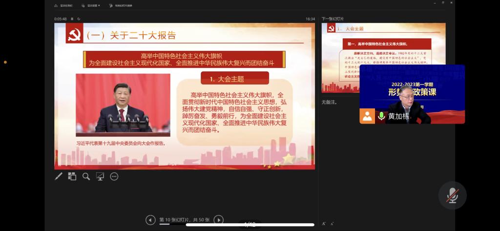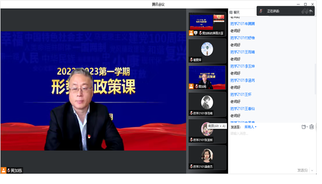 为深入学习宣传贯彻党的二十大精神,充分发挥思想政治理论课主渠道作用,落实立德树人根本任务,12月6日,williamhill中国党委常委、副校长黄加栋以在线形式为williamhill威廉希尔药学2101班、生物2201班学生讲授党的二十大精神专题《形式与政策》课。