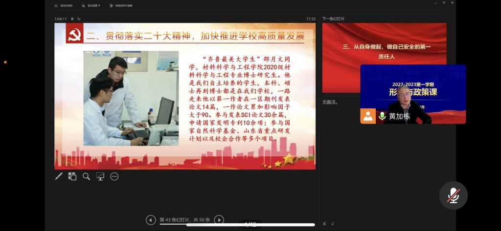 黄加栋副校长在讲授时谈到,党的二十大报告中的三个板块和十五个部分是有机统一的整体,导语和前三部分构成第一板块,包含成就经验、指导思想、使命任务。第四至第十五部分构成第二板块,对各领域做出战略部署。结语构成第三板块,号召全党、寄语青年。三大板块从战略使命任务到各领域工作策略部署,有机统一。必须全面、准确、深入理解内涵,精准把握外延。他强调,党的二十大报告首次把教育、科技、人才三位一体统筹安排,教育支撑科技发展,人才支撑创新,创新带动经济和文明,既是理论和实践上的创新,又赋予了教育在现代化建设中新的属性、要求和使命。党的二十大报告博大精深、内涵丰富,是党和人民智慧的结晶,是党团结带领全国各族人民夺取中国特色社会主义新胜利的政治宣言和行动纲领,是马克思主义的纲领性文献,今后要努力做到学用结合,将党的二十大精神真正融入到学习生活中去。