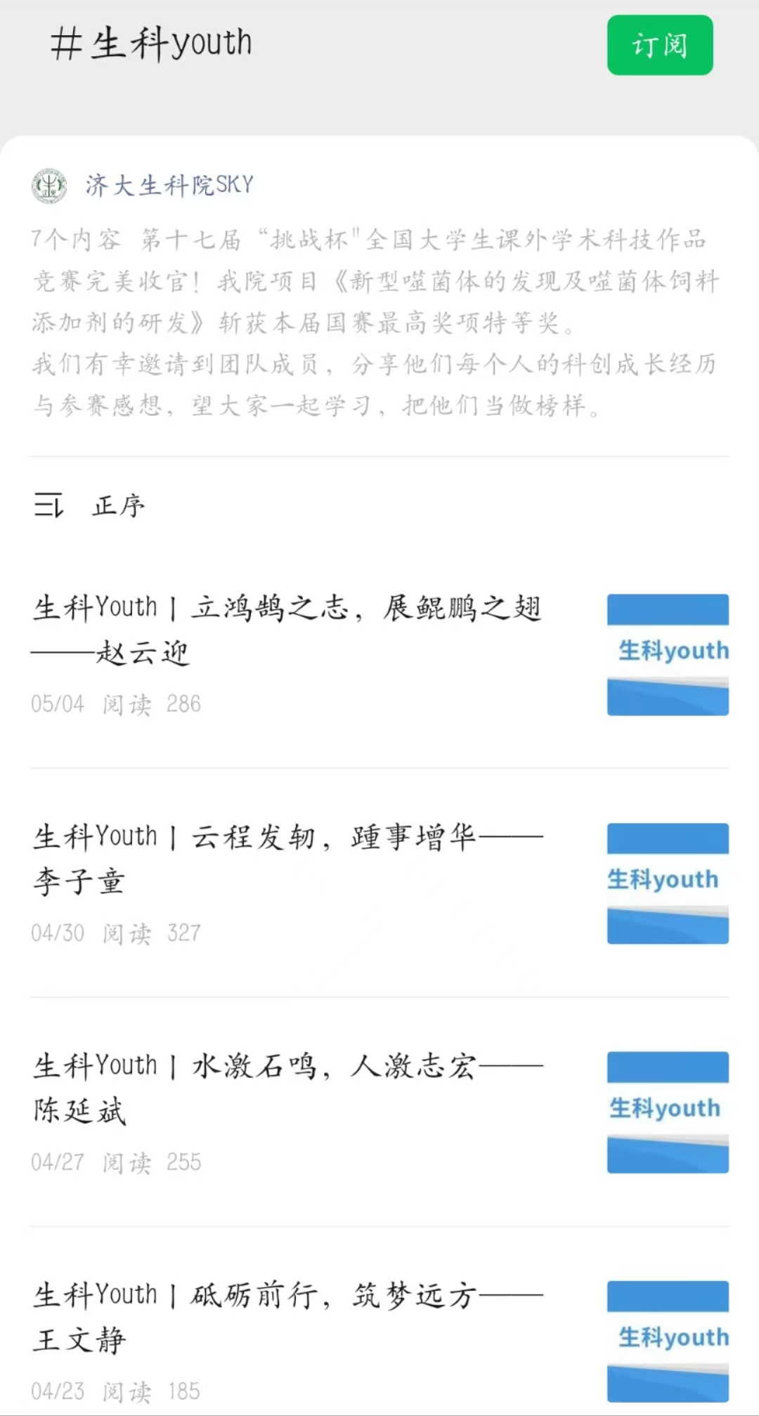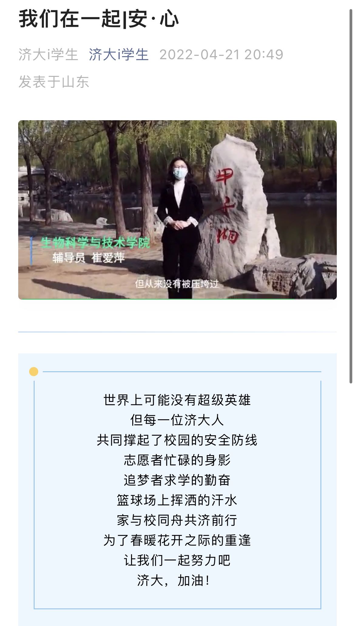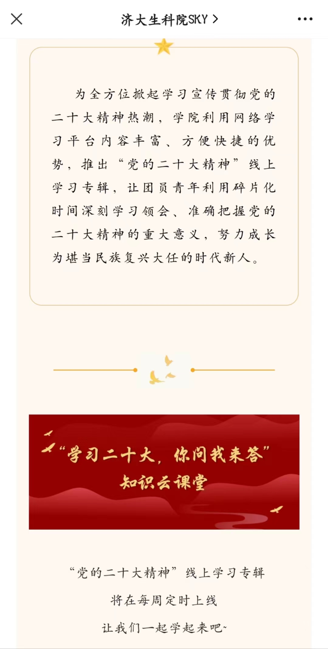开通“云端”课堂,拓宽育人形式。疫情防控形势下,依托学院公众号推出各类线上课程,在“济大生科院SKY”平台共发布文章197篇,收录并设立十个专辑,内容涵盖思政引领、科学创新、学风建设、志愿公益、学院要闻、节气节日、同心防疫等。在“团徽闪耀”线上课堂,发布“回望百年辉煌路,“青”听团史忆初心”文章10篇,“回望百年辉煌路,青春作答知团情”学习资料10篇,帮助同学们学习团史,筑牢初心;邀请考研学子分享考研经验与感悟,策划“研途”看生科云端课堂,发布文章19篇;为帮助新生尽快适应大学生活和环境,开设“迎新特辑--新生指南”,发表文章5篇;开设“学习二十大,你问我来答”知识云课堂,更好的学习宣传贯彻党的二十大精神;策划录制“泉”心“城”意,同舟共“济”抗疫宣传片;征集并确定学院卡通形象“小生”、“小可”,它俩是一对兄妹,也象征williamhill威廉希尔是一个充满关爱、团结一致的集体。